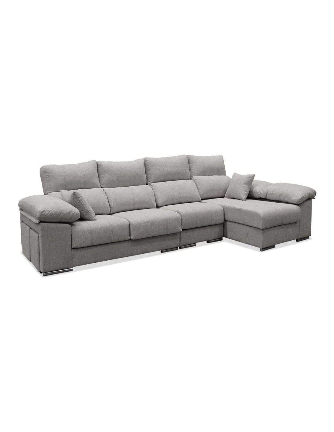 Chaise longue de 4 plazas con taburetes incorporados y tapizada en tejido antimanchas Acualine® de color gris. Cuenta con asientos deslizantes, respaldos reclinables y un diseño que combina comodidad y estilo. Disfruta de momentos de relax y confort en tu sala de estar con esta increíble chaise longue. Cojines decorativos incluidos.